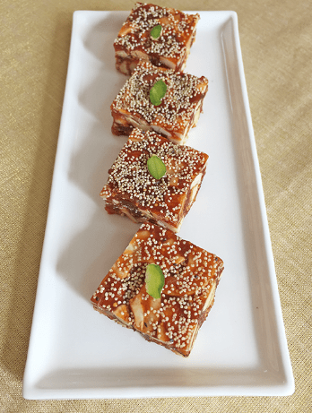 Anjeer Barfi is a delicious Indian sweet made from dried figs (anjeer), sugar, and ghee, cooked to a fudgy consistency. The barfi is often flavored with cardamom and garnished with chopped nuts, offering a rich, sweet taste. It is a popular dessert during festivals and special occasions, known for its unique flavor and texture.