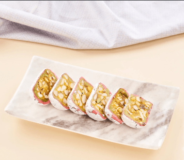 Dry Fruit Cassatta is a rich and indulgent dessert made with a blend of various dry fruits, nuts, and flavored with essence like cardamom or saffron. The base is typically made from a mix of cashews, almonds, pistachios, walnuts, and raisins, which are chopped or ground into a paste. The dry fruits are layered with sweetened milk or condensed milk, often set in a mold and refrigerated until firm. The dessert is decorated with edible silver foil and additional chopped nuts for an elegant finish. Dry Fruit Cassatta is a popular treat during festivals and celebrations, offering a delightful combination of sweetness, nuttiness, and a smooth texture.