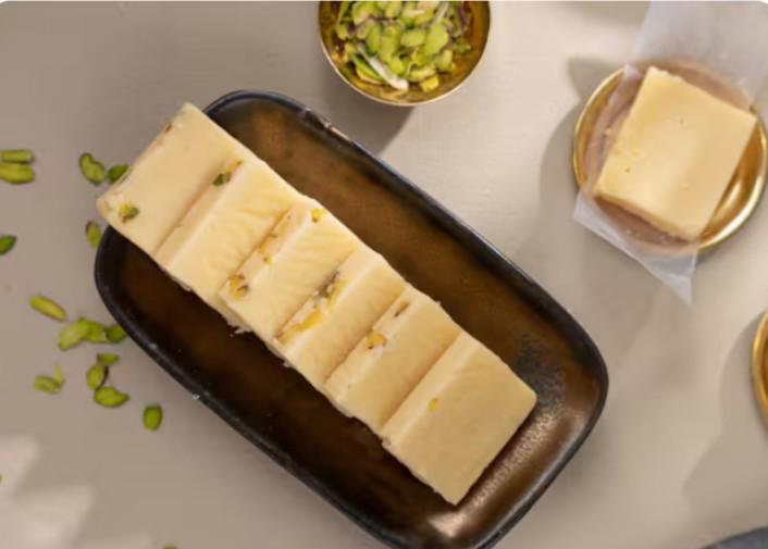 Ice Cream Barfi is a modern and indulgent twist on the traditional Indian sweet, combining the creamy texture of ice cream with the dense, sweet flavors of barfi. Made from condensed milk, khoya (mawa), and sugar, the base of this barfi is similar to that of regular barfi but with the addition of ice cream, which gives it a rich, smooth texture and a cooling effect. The mixture is flavored with various essences like vanilla, strawberry, or mango, and sometimes mixed with chopped nuts or fruit pieces. Once prepared, the mixture is allowed to set, cut into squares, and often garnished with edible silver foil or extra nuts. Ice Cream Barfi is perfect for summer or festive occasions, offering a delightful fusion of flavors and textures.