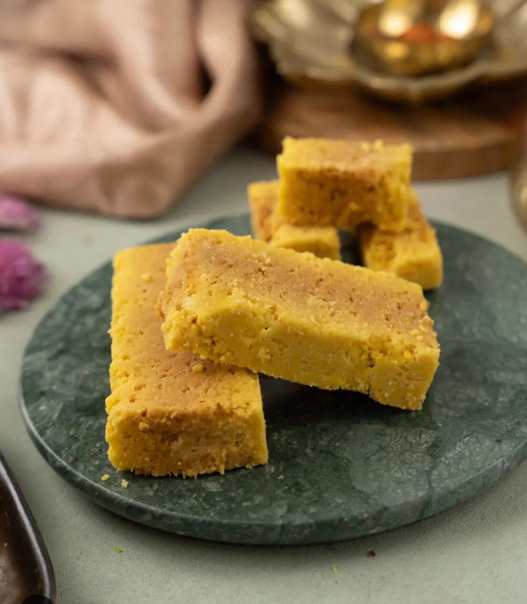 Jali Mysore Pak is a refined version of the traditional Mysore Pak, known for its delicate, porous texture. Made from a mixture of chickpea flour (besan), ghee, sugar, and cardamom, it is cooked to perfection until it forms a soft, melt-in-the-mouth consistency. The “jali” (net-like) texture is achieved by careful preparation, making it more airy and light compared to the traditional version. This rich and aromatic sweet is often enjoyed during festivals, weddings, and other special occasions. Its unique texture and flavor make it a beloved delicacy in South India.
