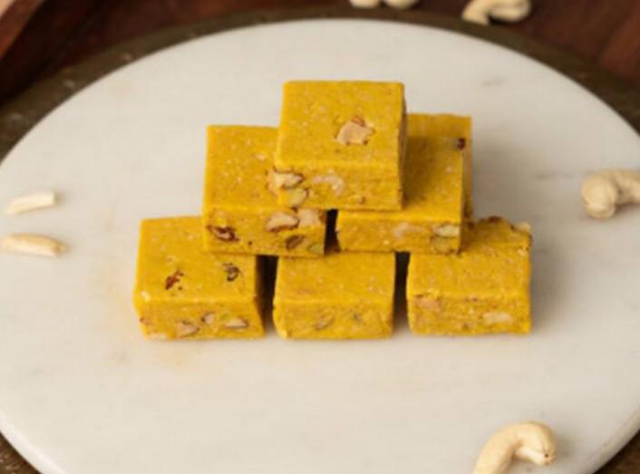 Kaju Mango Bite is a delightful fusion of cashews (kaju) and mango, combining the rich, nutty flavor of cashews with the sweet and tangy taste of mango. The base is made by grinding cashews into a fine powder or paste, which is then mixed with mango puree, sugar, and cardamom for flavor. The mixture is shaped into bite-sized pieces or squares and often garnished with a sprinkle of crushed cashews or dried mango pieces. This treat is typically served as a refreshing and exotic dessert during festivals or special occasions, offering a perfect balance of fruity and nutty flavors.