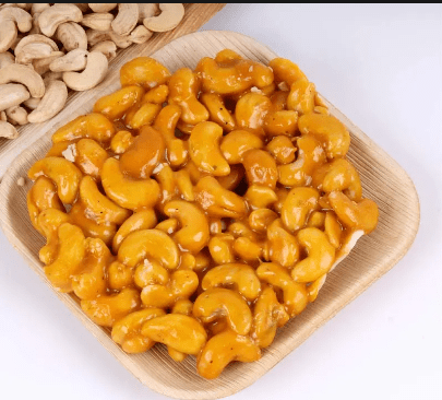Kaju Pakam is a traditional Indian sweet made primarily from cashews (kaju), sugar, and ghee. The cashews are ground into a paste and cooked with sugar syrup to create a smooth, fudge-like texture. The mixture is then set into a firm block and cut into pieces, often garnished with cardamom or saffron for added flavor. This rich and indulgent sweet is commonly enjoyed during festivals and special occasions. Its melt-in-the-mouth texture and nutty flavor make it a popular choice among dessert lover