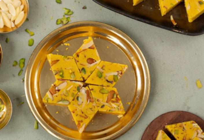 Kesar Dry Fruit Barfi is a rich and flavorful Indian sweet made from a combination of dry fruits, saffron (kesar), and condensed milk or khoya (mawa). The dry fruits, such as almonds, cashews, pistachios, and raisins, are chopped and mixed into a sweet, saffron-infused base. The mixture is cooked with ghee and sugar until it thickens, and then spread into a flat layer to set. Once firm, the barfi is cut into square or diamond shapes and often garnished with slivers of pistachios or almonds. The addition of saffron gives this barfi a vibrant golden color and a delicate aroma, making it a luxurious treat for festivals and special occasions.